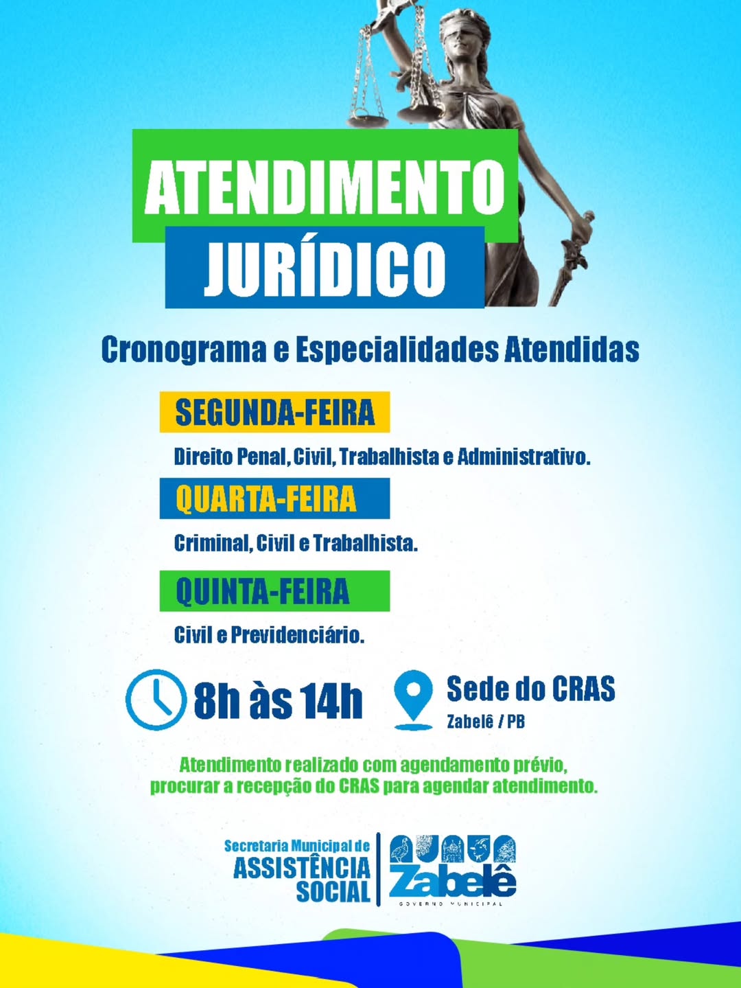 Secretaria de Assistência Social informa que está sendo disponibilizado atendimento jurídico para a população, oferecendo orientação e apoio em diferentes áreas do direito.