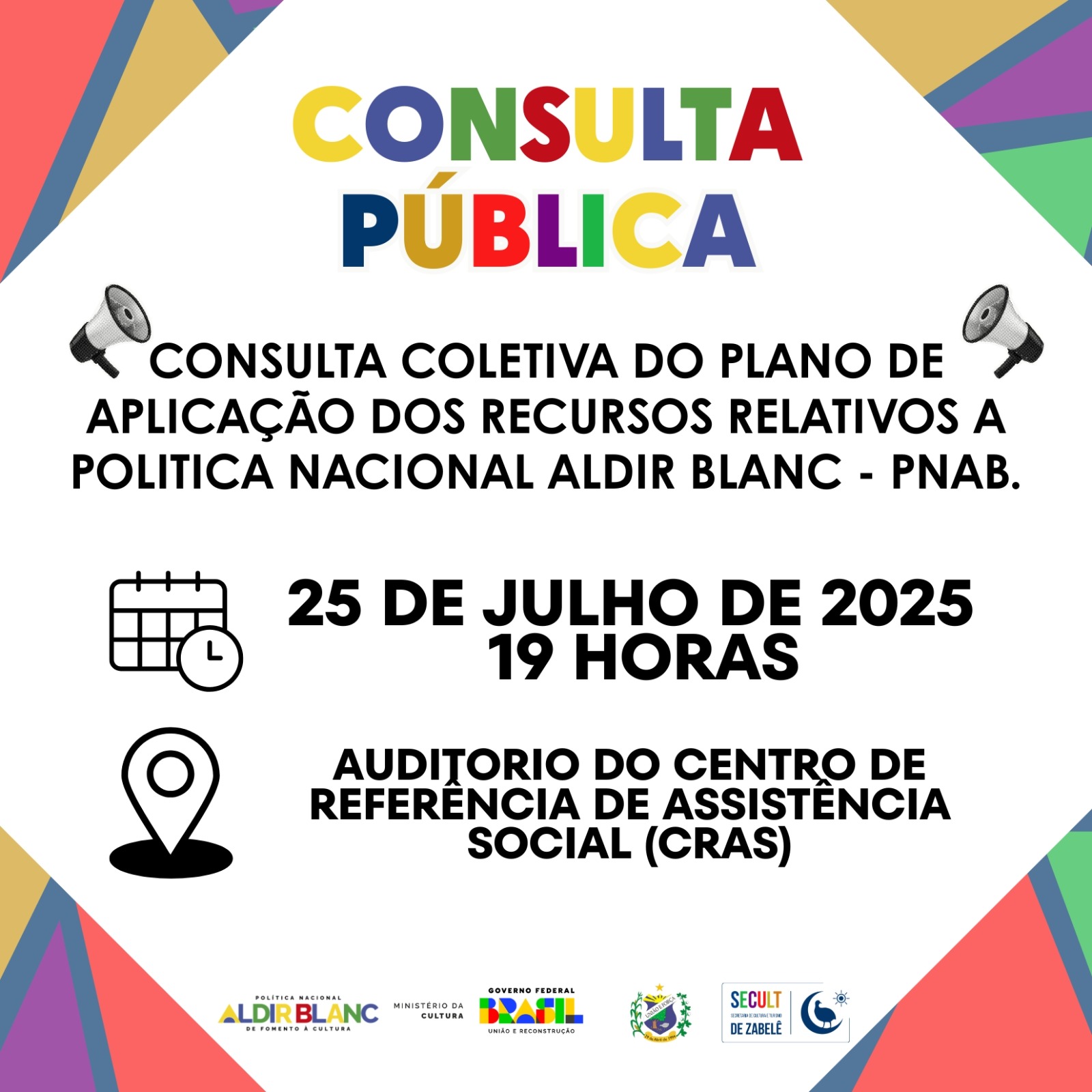 A Secretaria Municipal de Cultura e Turismo de Zabelê convida toda a classe artística e cultural para participar da Consulta Pública do Plano de Aplicação dos Recursos (PAR) da Política Nacional Aldir Blanc (PNAB).